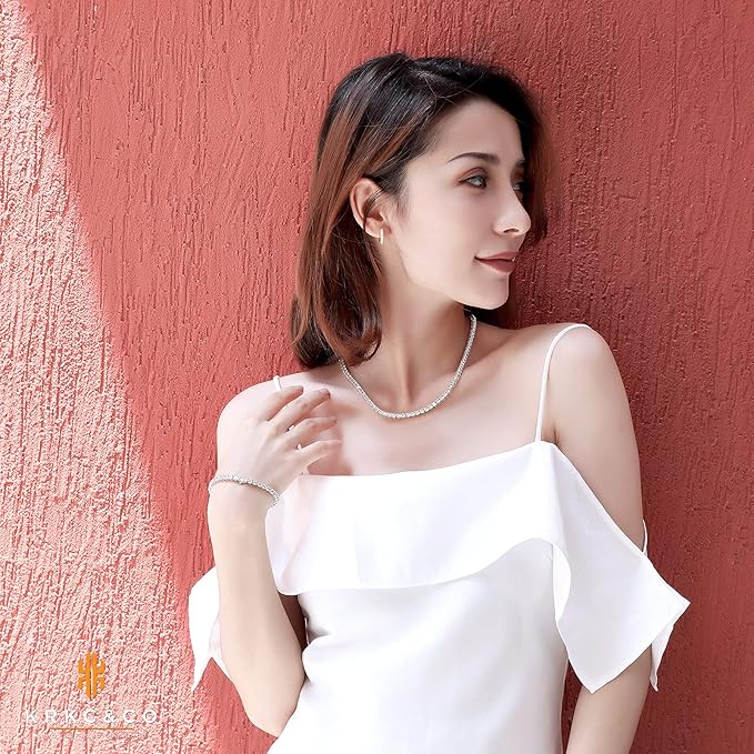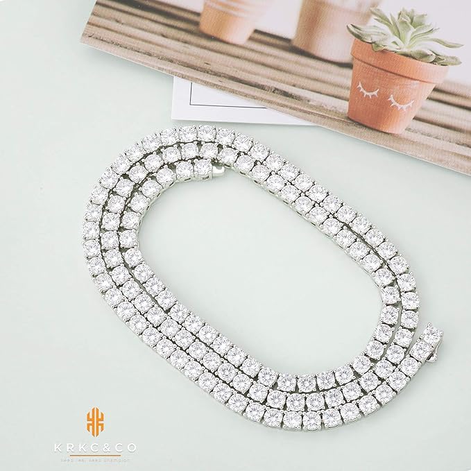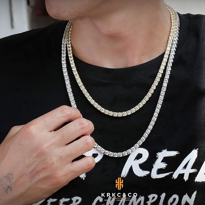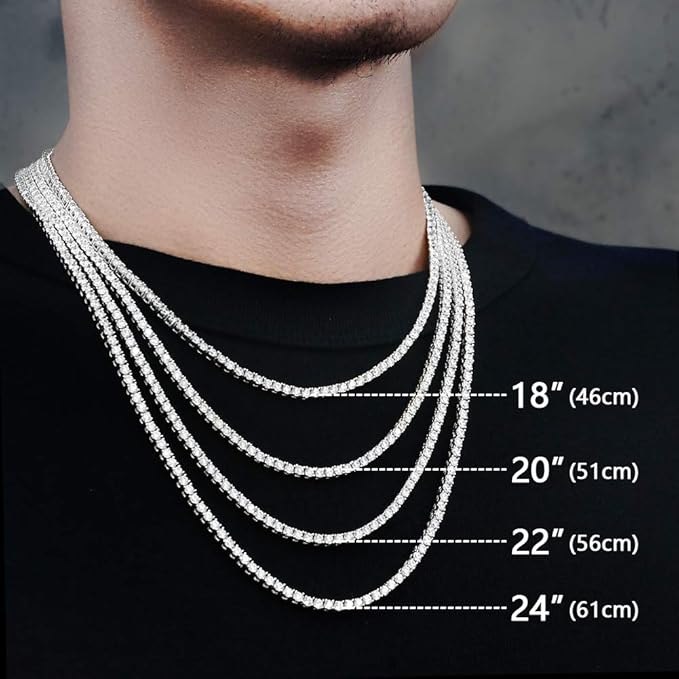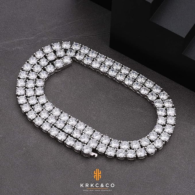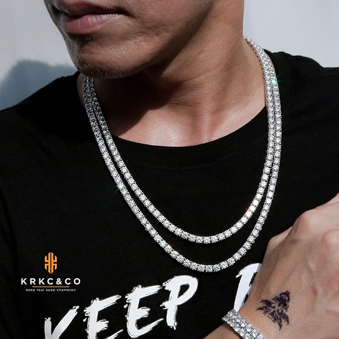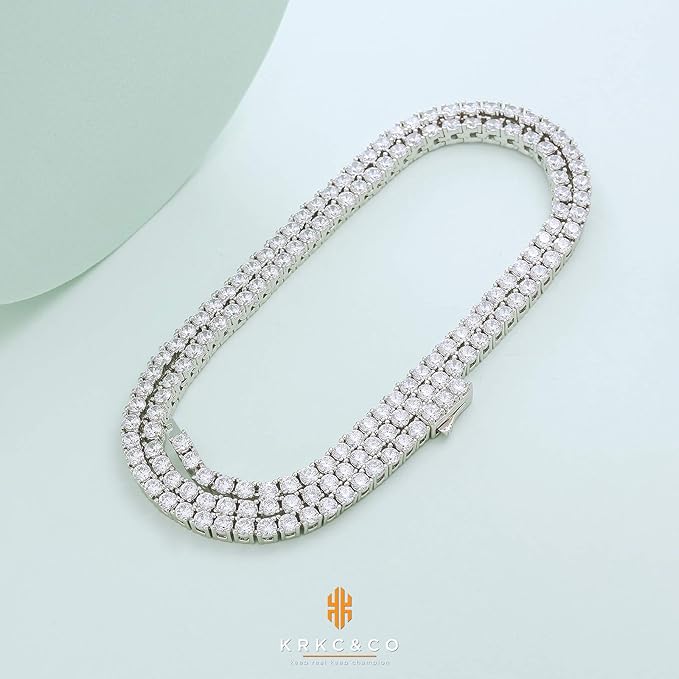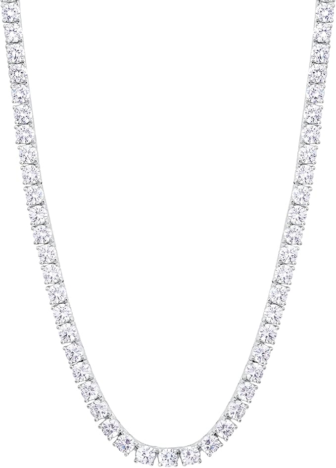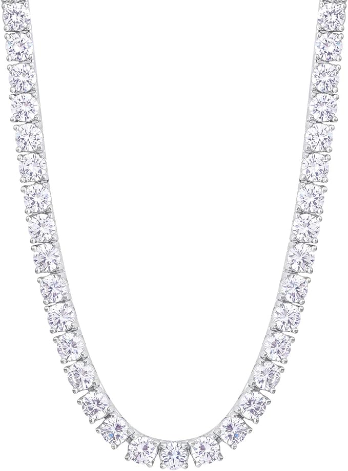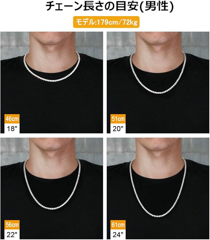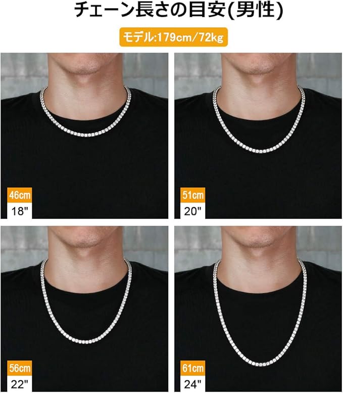 | 存在感抜群の一品 | 幅5mmのCZダイヤストーンを80粒以上配置したラグジュアリーなテニスネックレスです。リッチな印象を与えるテニスチェーンは単体でも存在感抜群の一品。定番チェーンに物足りなさを感じている人にぜひお勧めです。 |