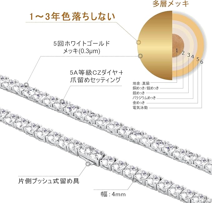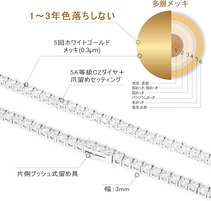 | しっかりした作り | 素材は展延性に優れる真鍮とホワイトゴールドのメッキ加工。5回もメッキ(0.3μm)をかけているため、耐食性にも優れ、汗などの影響を受けにくく、日常使用ではほとんど黒ずみや変色の心配はありません。 |