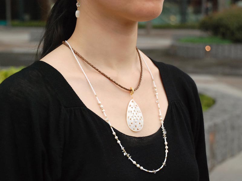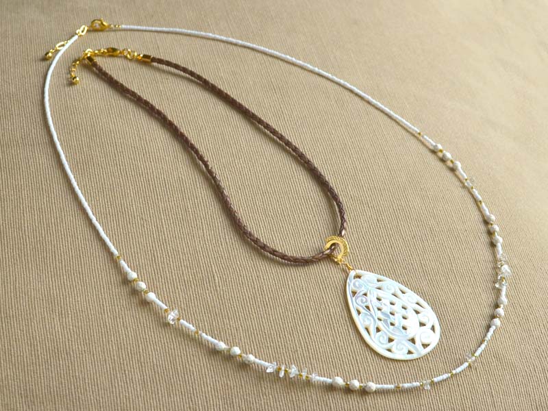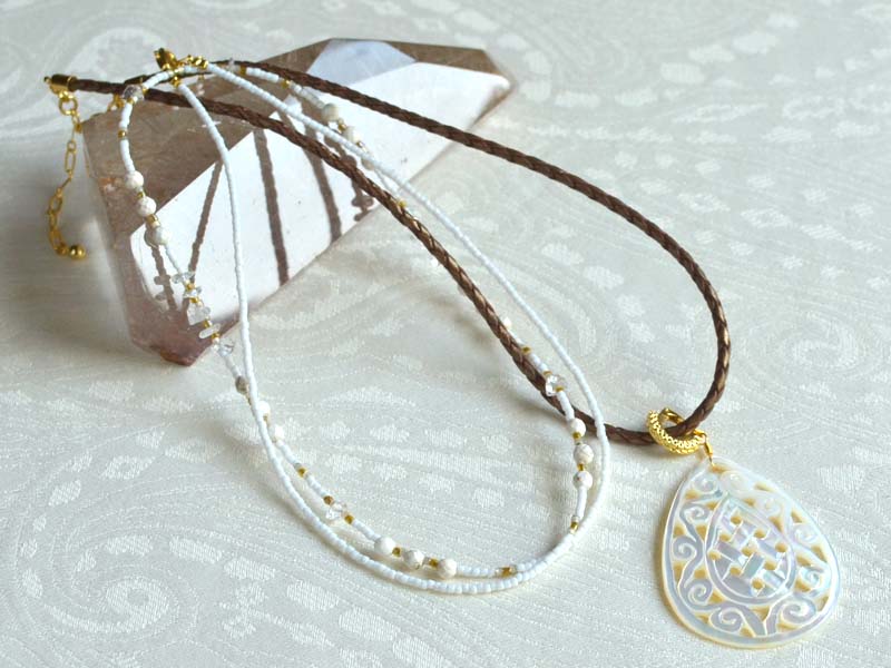 | 商品について | クォーツ、マグネサイトにガラスビーズを合わせたロングタイプのネックレス、革ひものショートネックレス、シェルのトップをお得なセット価格で販売。 カービングを施した大きなシェルのトップは取り外し可能ですので、付け替えをして楽しめます。2本重ねづけにしてコーディネートすると華やかに。さまざまなバリエーションを楽しめるネックレスセットです。 |