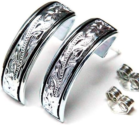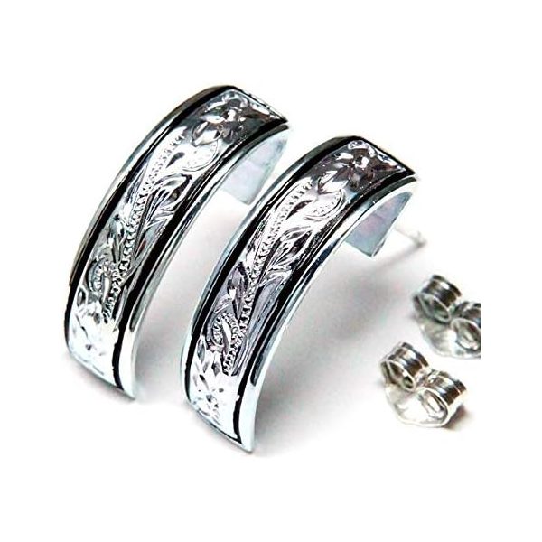★商品のコメント★ 上品な華やかさが特徴のハーフムーン型フレームに人気定番中の定番・プルメリア(花)&スクロール(波)の彫り模様を使い美しいデザインに仕上げたハワイアンジュエリーレディースシルバー925スタッドピアスです。ベースとなるハーフムーンのフレームは通常よりややスレンダーな6mm幅を使い、より上品で聡明なイメージを感じさせるシルエットデザインとなっています。装飾のメインとなるプルメリア&スクロールの彫り模様がトロピカルな雰囲気漂う装飾の美しい彩りとなっていますね。ハワイアンジュエリーの得意とする高度な彫金技術を駆使した彫り模様は、ピアスデザイン全体に高級感を与えるとても華やかな装飾になっています。カラーデザインに大人びたイメージを与えているのがフレームのアウトラインに使われているブラックエナメル樹脂です。ブラックカラーが入ることで黒のイメージさせるシックな大人の印象を持たせながらも耳元に十分過ぎる程のアクセントを与えてくれます。ピアス全体にはプラチナ仕上げとも呼ばれるホワイトロジウムがコーティングされていますので、フレームが光を受ける度に耳元から白金色の輝きを放ち出し高級感も十分です!ピアスの裏側には良質なシルバーの証である925の刻印もしっかりと入っています。聡明さと華やかさを併せ持ち、さらにシックエレガントな大人のムードに加え高級感も兼ね備えたこちらのピアスは、当店が自信を持ってぜひオススメするハワイアンジュエリーレディースシルバー925ピアスです。
