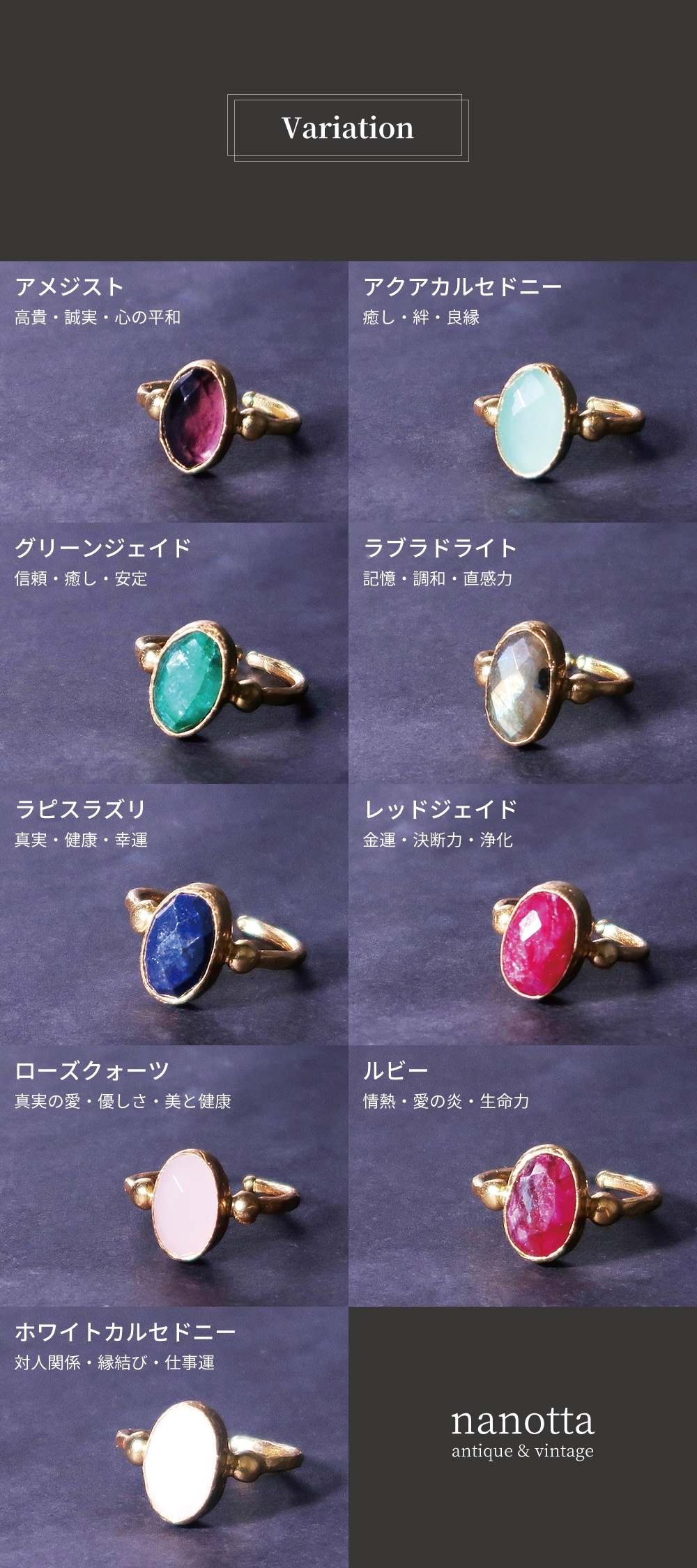 アメジスト, アクアカルセドニー, グリーンジェイド, ラブラドライト, ラピスラズリ, レッドジェイド, ローズクオーツ, ルビー, ホワイトカルセドニー