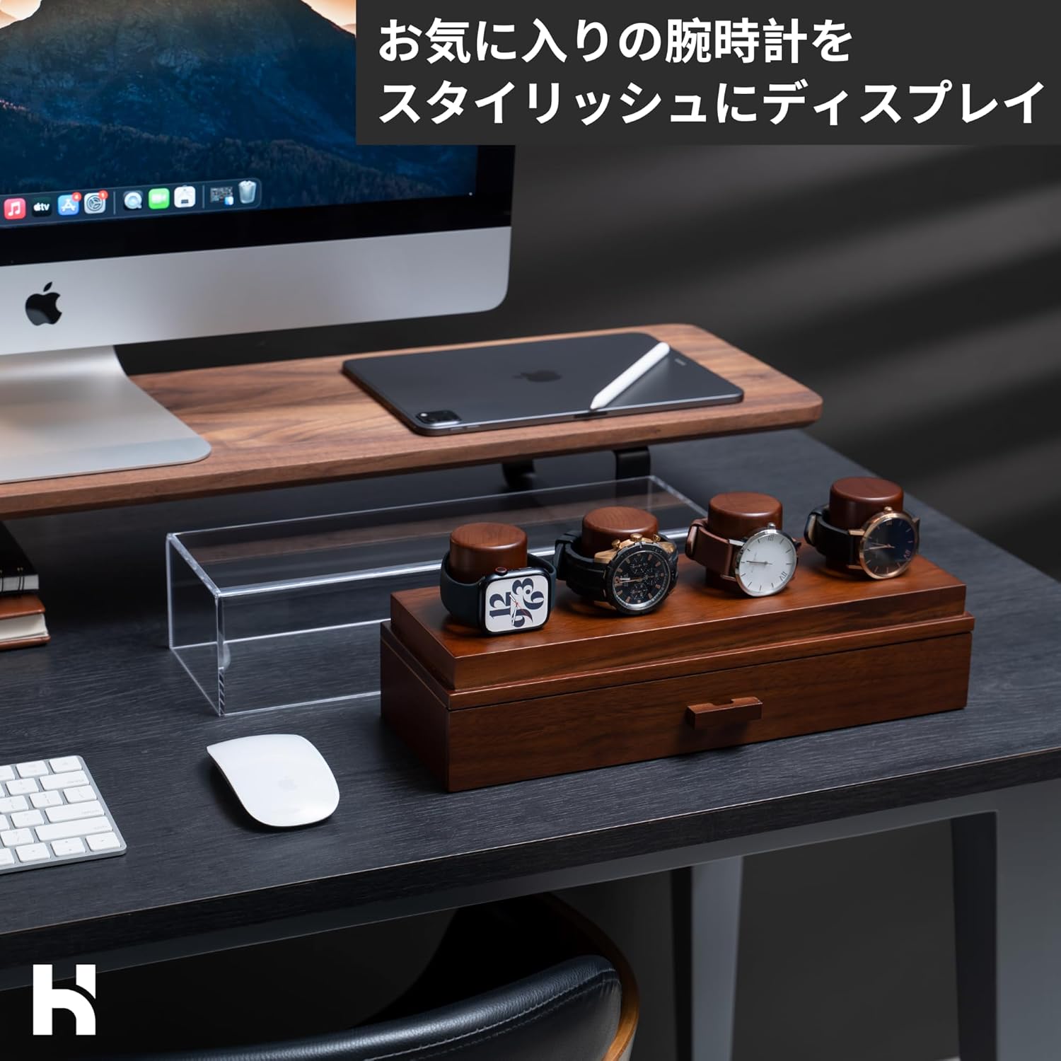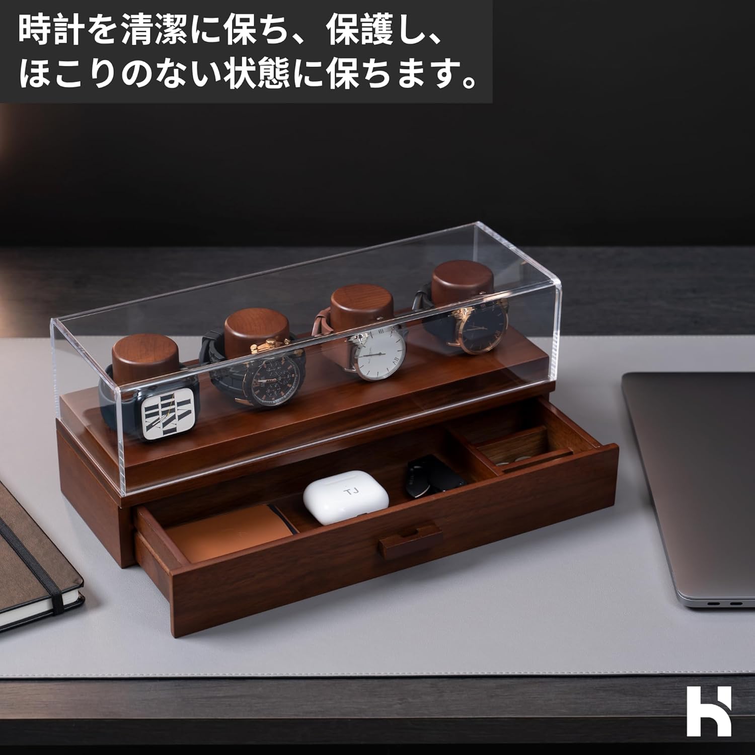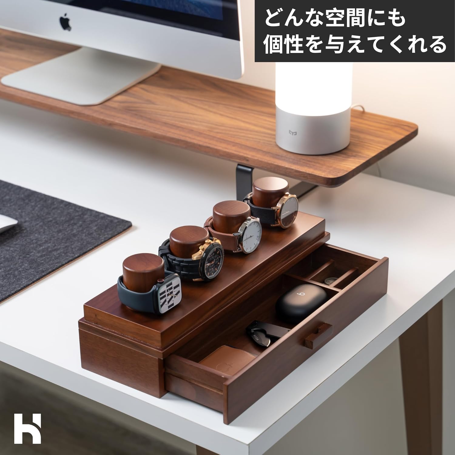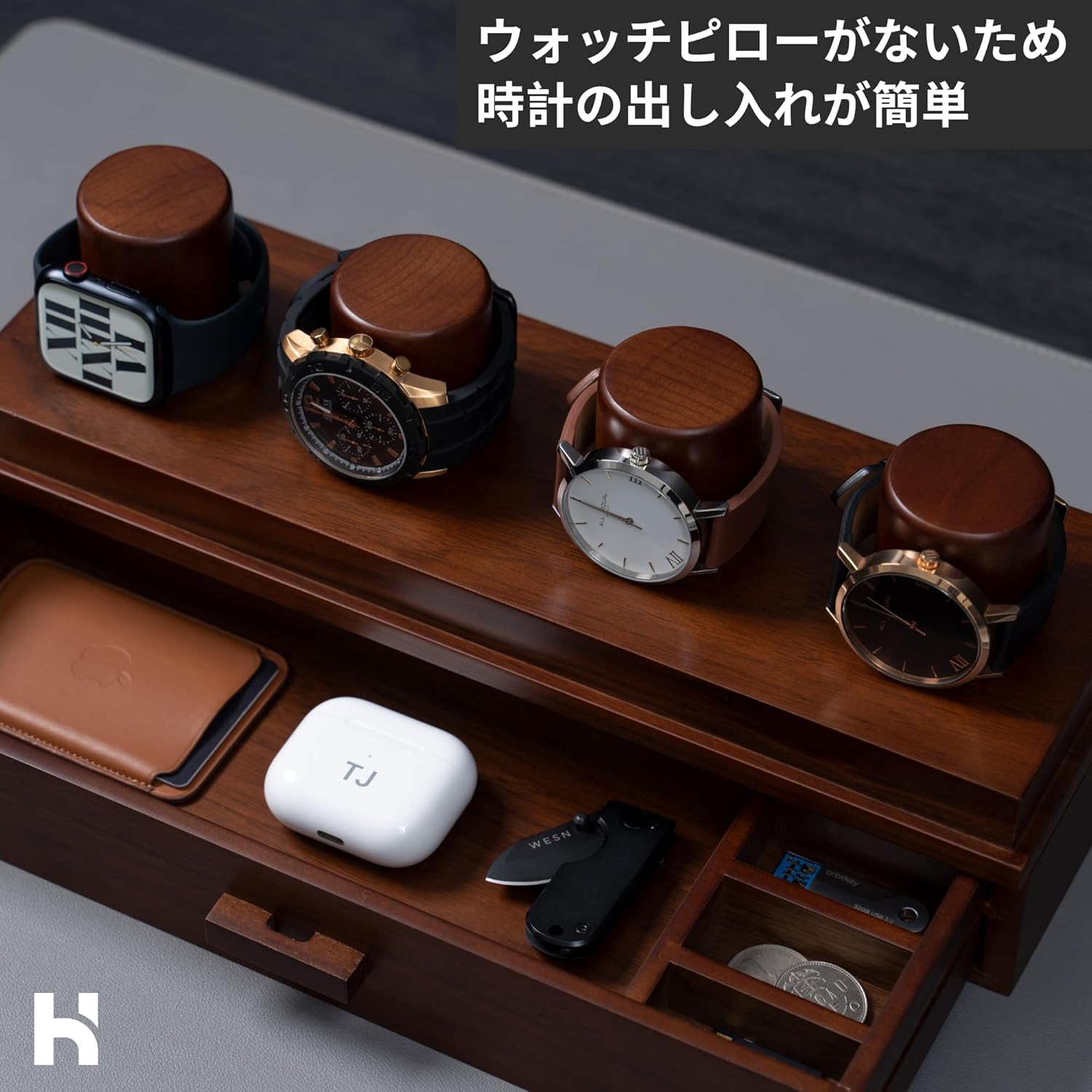 - お気に入りの時計のためのホーム:特許取得済みの洗練されたデザインが特徴の木製メンズウォッチケースは、父の日の贈り物にも最適です。4つのスタンドに時計コレクションをディスプレイし、引き出しには日常的に持ち歩くアイテムを収納できます。