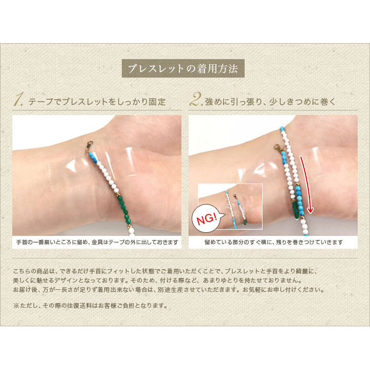 | お取り扱い-ご注意点- | こちらのブレスレットのワイヤーは、比較的強度がしっかりとしておりますが、永くお使い いただくために、ご使用の際にご注意いただきたい点が、大きく分けて3点御座います。 (1)着用する際に (2)水濡れを避ける (3)ワイヤー伸びについて また、特に就寝時や洋服着脱時など着けっぱなしにする事で、無意識に引っ掛けや引っ張られが発生し、徐々に負荷が掛かる可能性もありますのでご注意くださいませ。 当店にて様々なコードの比較検証を行い、比較的強度の高いワイヤーコードを採用しております。そのため、負荷が掛かった場合にはすぐに切れる事はなく、徐々に伸びていく仕様となっております。 なお、万が一商品不備などが生じた場合、有償にて修理も承っております。 ※初期不良に限り修理費用は当店負担 お値段は修理内容により異なりますので、修理内容など含め、まずはお気軽にご相談くださいませ。 ※2021年7月7日にワイヤーの仕様を変更しました |